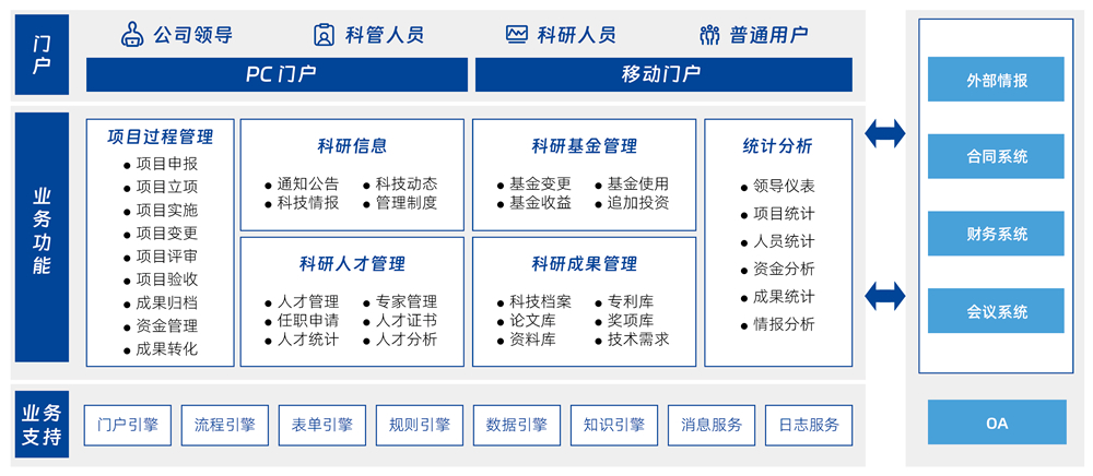 企業科研一體化管理平臺,涵蓋科研項目全生命周期管理,能夠對科研信息、科研基金信息、科研人才、科研成果全方位管理,并實現統計分析??珊暧^把控項目資金、資源分配;可實時查看科研項目核心業務數據報告并進行深度分析;可實時監控各個項目動態。