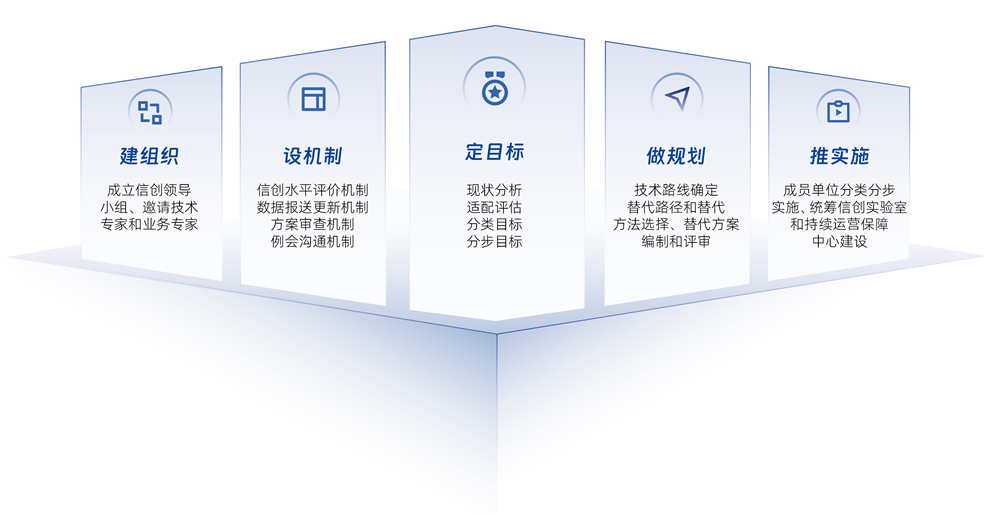 分步推進現(xiàn)狀摸底、分類梳理、實驗評估、路徑選擇、架構設計、方案編制、產品匹配等 環(huán)節(jié),保障信創(chuàng)替代真正落地。
