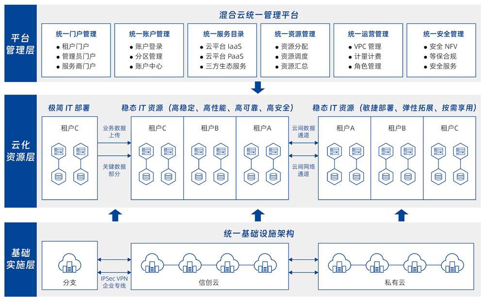 面向已部署多云、信創(chuàng)基礎設施的行業(yè)用戶,提供自助化、自動化的云服務快速交付服務。管理企業(yè)內部多個數(shù)據(jù)中心的物理、虛擬資源,以及容器、私有云、公有云資源,并對以上資源進行混合編排,提供基礎軟件和應用軟件的自動化部署服務,以及云資源的全生命周期管理。