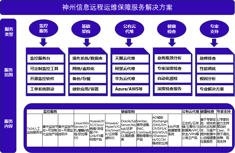 依托7×24小時(shí)智能監(jiān)控中心、專業(yè)化運(yùn)維管理平臺(tái)及資深級(jí)技術(shù)專家團(tuán)隊(duì),構(gòu)建三位一體的遠(yuǎn)程運(yùn)維服務(wù)體系,提供包括對(duì)公有云、私有云、機(jī)房、網(wǎng)絡(luò)、服務(wù)器、操作系統(tǒng)、存儲(chǔ)、備份、數(shù)據(jù)庫(kù)、中間件、應(yīng)用、安全等ICT基礎(chǔ)設(shè)施的遠(yuǎn)程保障服務(wù)。為客戶數(shù)字化轉(zhuǎn)型、人工智能、云計(jì)算、物聯(lián)網(wǎng)、區(qū)塊鏈、數(shù)字資產(chǎn)等前沿技術(shù)領(lǐng)域保駕護(hù)航,驅(qū)動(dòng)客戶數(shù)字創(chuàng)新進(jìn)程。