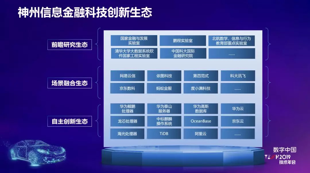 在生態創新方面,神州信息加強與生態伙伴的深度合作,共建生態。比如與擁有底層基礎軟硬件研究能力的華為、龍芯等企業打造自主創新生態;與科大訊飛和BATJ等攜手打造場景融合生態;并借助外腦,與國家金融與發展實驗室、鵬城實驗室、北航及清華大學等一系列院校、外研單位達成戰略合作,在前瞻研究方面開拓視野,構建生態。