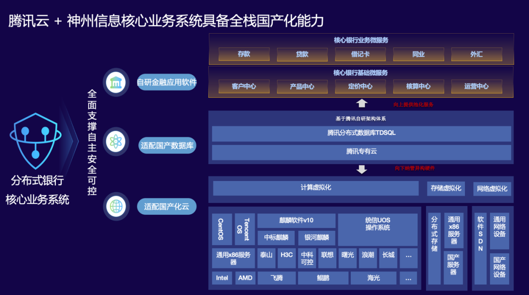 “金融分布式核心”聯(lián)合方案整體基于安全可控計算網(wǎng)絡(luò)基礎(chǔ)平臺,結(jié)合騰訊與神州信息在金融領(lǐng)域各自優(yōu)勢,聯(lián)合金融級分布式數(shù)據(jù)庫TDSQL及神州信息Sm@rtEnsemble分布式核心業(yè)務(wù)系統(tǒng),同時使用多種國內(nèi)安全可控服務(wù)器設(shè)備及各類國產(chǎn)操作系統(tǒng)。該聯(lián)合解決方案全面適配國內(nèi)安全可控架構(gòu)和技術(shù)方案,為銀行核心業(yè)務(wù)領(lǐng)域提供全棧式數(shù)字化轉(zhuǎn)型解決方案。