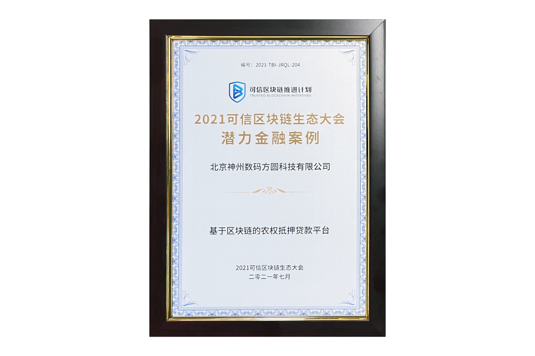 7月13日,由中國信息通信研究院、可信區塊鏈推進計劃主辦的“2021可信區塊鏈生態大會”在京舉辦,并隆重發布系列成果。神州信息子公司北京今年會方圓科技有限公司(簡稱:神州方圓)推薦的“基于區塊鏈的農權抵押貸款平臺”榮獲十大金融應用高潛力案例,為“區塊鏈+農業”落地帶來示范效應。