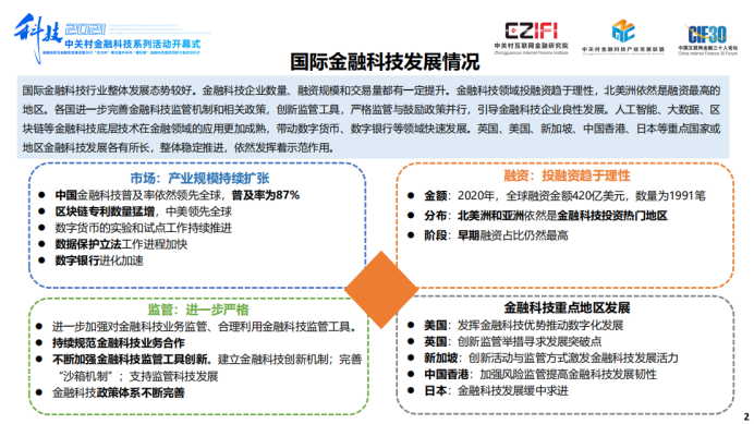 國際金融科技行業整體發展態勢較好。金融科技企業數量、融資規模和交易量都有一定提升。金融科技領域投融資趨于理性,北美洲依然是融資最高的地區。各國進一步完善金融科技監管機制和相關政策,創新監管工具,嚴格監管與鼓勵政策并行,引導金融科技企業良性發展。人工智能、大數據、區塊鏈等金融科技底層技術在金融領域的應用更加成熟,帶動數字貨幣、數字銀行等領域快速發展。英國、美國、新加坡、中國香港、日本等重點國家或地區金融科技發展各有所長,整體穩定推進,依然發揮著示范作用。