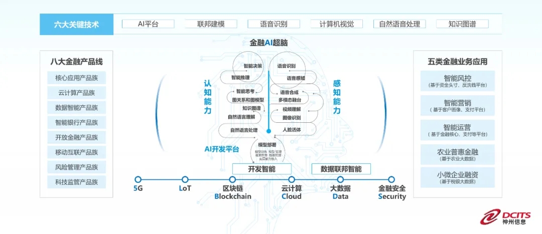 神州信息金融超腦Sm@rtFSB的整體技術架構按照“一基一核兩翼”整體研發路標進行搭建,以金融AI開發平臺為基礎,以金融核心應用智能化為核心,打造金融行業的感知能力和認知能力,賦能金融產品和行業應用。
