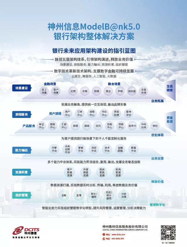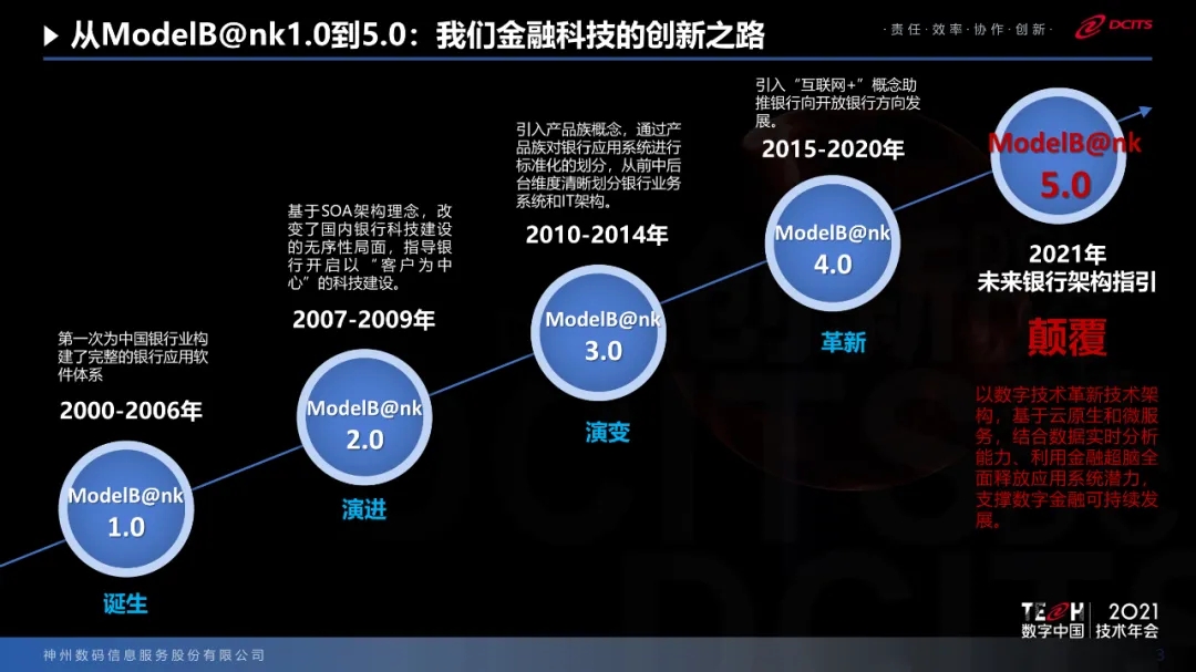 在中國銀行業40余年的科技創新發展歷程中,神州信息通過發布5代ModelB@nk銀行架構整體解決方案,始終指引中國銀行業的IT架構整體設計和規劃。神州信息是國內最早從事整體IT架構研究的金融科技廠商,ModelB@nk1.0于2000年初始發布,到2015年演進到了4.0版本。來到2021年,歷經六年打磨規劃的5.0版本積極擁抱金融數字化發展新趨勢,通過對未來IT架構的整體規劃設計,幫助銀行建立符合自身特點的以及信創要求的技術和應用體系,助力業務快速發展與安全運行。