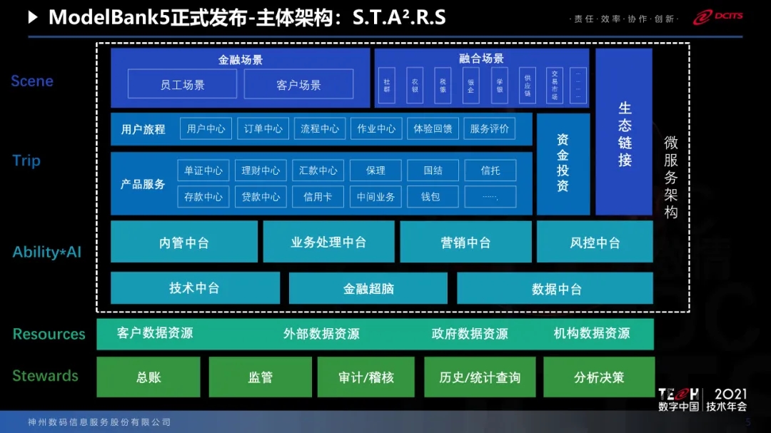 國家提出的信創工程,今年有120家銀行單位參與到信創的試點當中,也為我們提出了新的命題,就是如何保證在科技架構下保障國家安全體系的建設?;诳萍嫉淖兓约般y行業的變化,我們推出了ModelB@nk5.0。