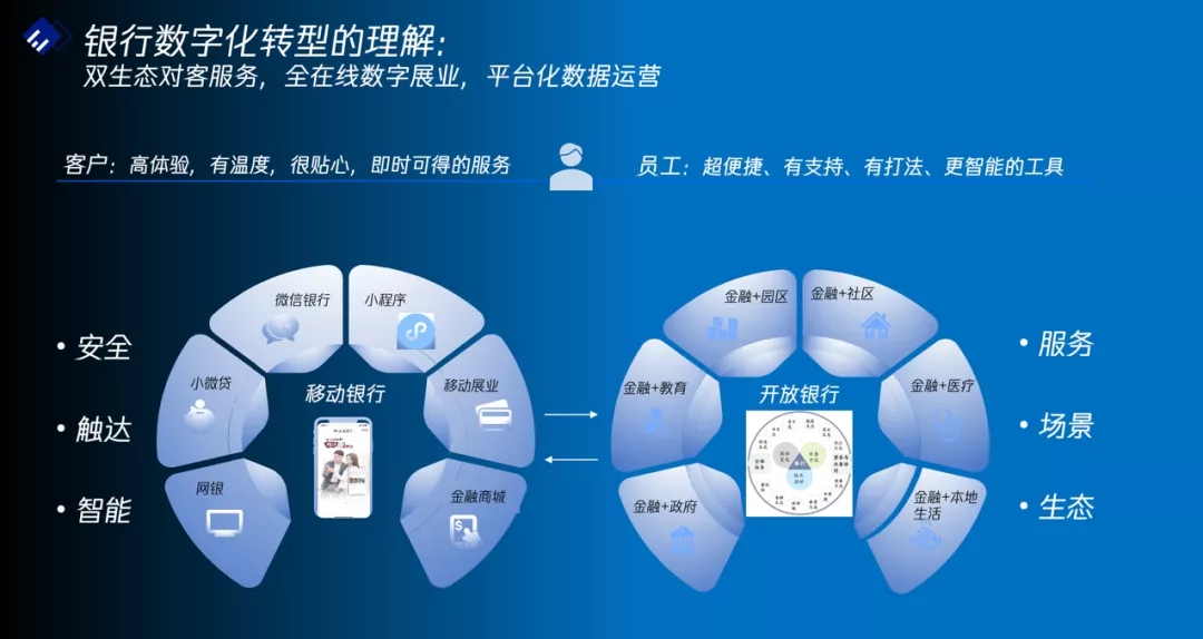 在銀行數字化轉型聯合解決方案中,首先從用戶視角出發來全面構建數字化服務能力,其中既包括銀行的用戶,也包括銀行內部運營及管理人員。一方面以銀行用戶的體驗為中心,提供全面的數字化、智能化、旅程化服務體驗,通過構建雙生態的客戶旅程,在加強銀行自營渠道的金融場景建設同時,持續推進“場景+金融”、“產業+金融”的數字化融合服務的深度和廣度。另一方面從銀行內部運營及管理人員角度,以開放的理念、敏捷的組織、數字化流程、智能化工具來提升銀行面對客戶和市場的快速反應能力,包括對客戶訴求的快速反饋、產品的創新及敏捷發布、展業模式的拓展等,通過兩個用戶視角,內外兼修、相輔相成,來打造極致體驗、高效運轉的數字化銀行。