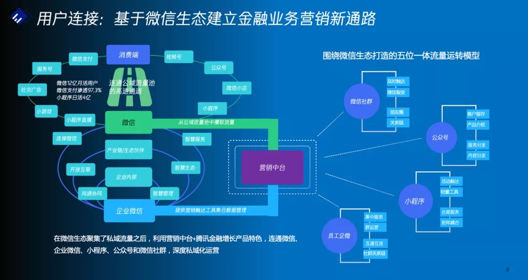 在零售用戶的連接及拓展運營中,可以基于微信生態加速銀行私域流量的聚集后,通過營銷中臺連通微信、企業微信、小程序、公眾號和微信社群,深度開展私域化運營,并基于產品服務層和用戶旅程層為用戶提供特色化的金融產品和旅程式的用戶服務。