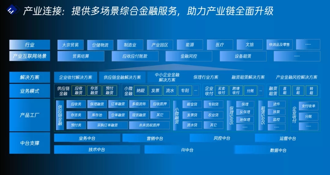 在產業連接方面,聯合方案基于業務中臺、風控中臺、數據中臺、AI中臺等一系列中臺層支撐,提供了企業收付、現金管理、小微融資、供應鏈金融等多樣化的專業金融服務平臺。在專業化的服務能力方面,針對不同的產業形態、業務場景甚至具體的企業客戶,可在中臺層和產品服務層之上快速靈活定制專業化、特色化、一體化的綜合金融服務解決方案,真正實現“產業+金融”的數字化融通,使得金融能力能夠高效輸出到產業端,為實體經濟賦能。