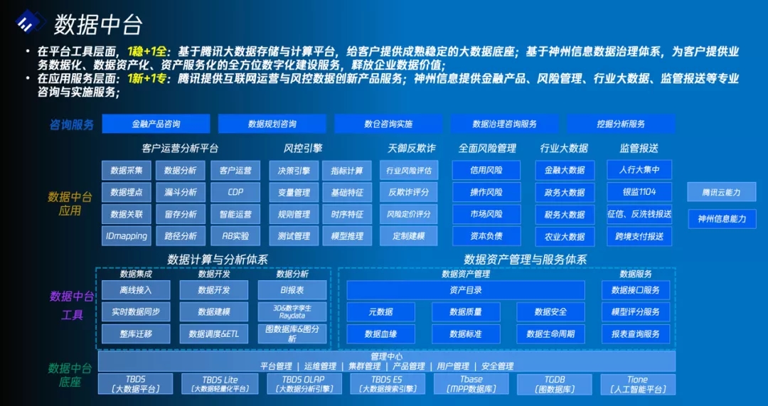 數據中臺聯合方案充分結合雙方優勢,圍繞數據的“采、存、建、用、管”全生命周期流程,實現數據標準化、智能化、資產化、服務化,快速滿足多樣性的業務需求,助力金融機構釋放數據價值,加速數字化轉型。其中,在平臺工具層面,基于騰訊云大數據處理套件TBDS,為客戶提供成熟穩定的大數據底座;基于神州信息數據治理體系,為客戶提供業務數據化、數據資產化、資產服務化等全方位數字化建設服務,釋放企業數據價值。在應用服務層面,騰訊云提供互聯網運營與風控數據創新產品服務;神州信息則提供涵蓋金融產品、風險管理、行業大數據、監管報送等領域的專業咨詢與實施服務。