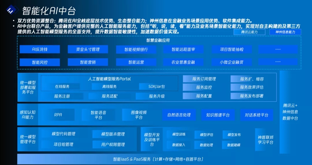 AI中臺聯合方案將結合騰訊在智能語音、智能圖像、RPA、多方安全計算/聯邦學習、數據標注、人工智能建模平臺等全棧人工智能底層技術優勢和神州信息在自然語言處理、知識圖譜、對話系統方面的感知認知AI能力及在智能風控、智能營銷、智能運營、普惠金融、AI反洗錢、智能視頻銀行、智能面審等人工智能應用場景豐富的落地經驗,為金融行業用戶提供完整一站式的人工智能服務能力,幫助金融行業用戶實現“聽,說,讀,看”的人工智能能力,同時通過數據標注能力、數據挖掘建模和模型服務能力,方便金融行業用戶實現人工智能相關模型及應用的自主構建,進而提升數據智能的敏捷性,加速數據價值變現。
