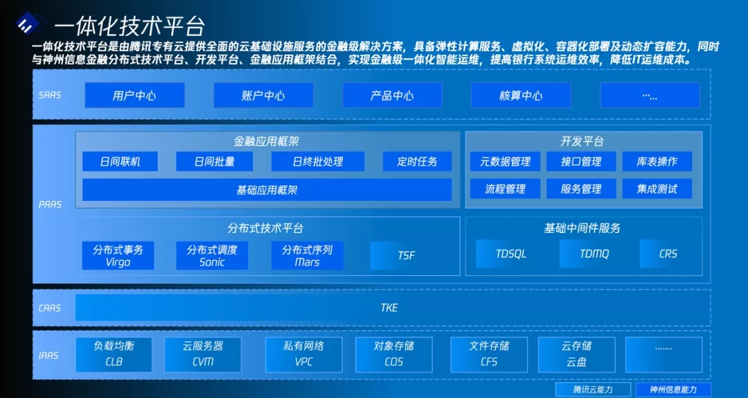 一體化技術平臺是由騰訊專有云提供全面的云基礎設施服務的金融級解決方案,具備彈性計算服務、虛擬化、容器化部署及動態擴容能力,包含自動化部署、系統監控、分布式協同、遠程過程調用、任務調度和資源管理以及分布式文件系統,SAAS應用自助分析、鏈路監控、配置中心、業務集成化監控、應用生命周期管理等豐富的功能,同時與神州信息金融分布式技術平臺、開發平臺、金融應用框架結合,實現金融級一體化智能運維,提高銀行系統運維效率,降低IT運維成本。