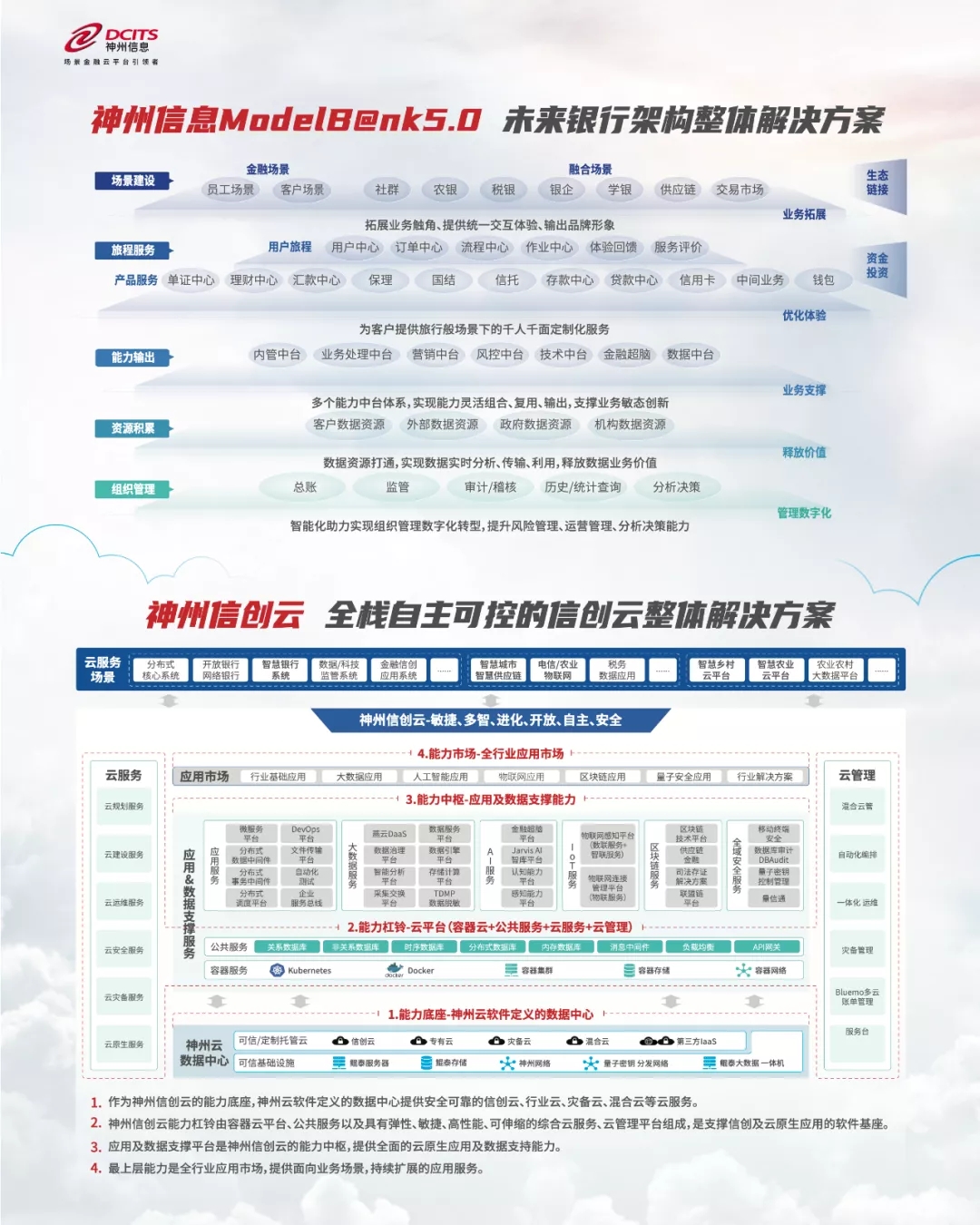 ModelB@nk5.0和神州信創(chuàng)云是神州信息在2021技術(shù)年會(huì)上最新發(fā)布的前沿技術(shù)成果。旨在以大數(shù)據(jù)、人工智能、區(qū)塊鏈等數(shù)字技術(shù)為驅(qū)動(dòng),賦能金融科技創(chuàng)新及各行業(yè)數(shù)字化轉(zhuǎn)型,服務(wù)實(shí)體經(jīng)濟(jì),踐行數(shù)字中國(guó)使命。