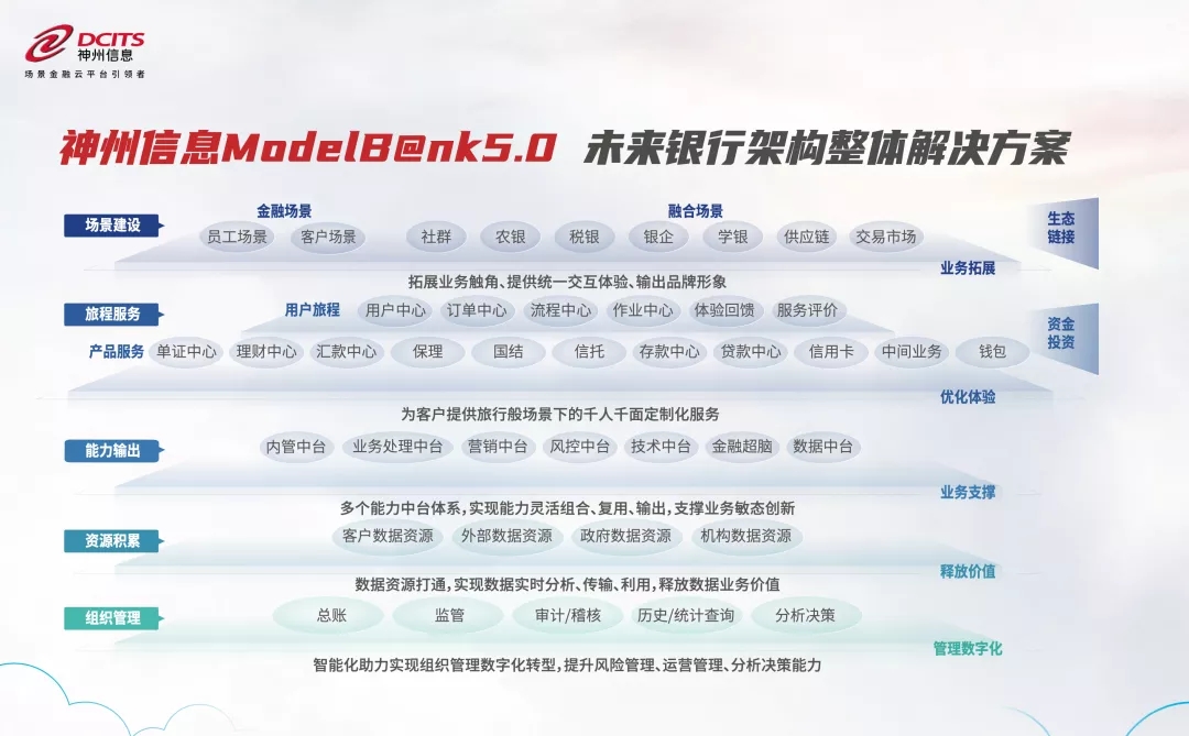 神州信息ModelB@nk5.0是繼2000年發(fā)布第1代后更新至第5代,旨在為銀行業(yè)的應(yīng)用架構(gòu)提供指引藍(lán)圖,以技術(shù)中臺(tái)、數(shù)據(jù)中臺(tái)以及金融超腦為支柱,圍繞 “場(chǎng)景建設(shè)” “旅程服務(wù)” “能力輸出” “資源積累” “組織管理”五個(gè)層次的業(yè)務(wù)發(fā)展述求提供清晰的數(shù)字化支撐能力,助力金融機(jī)構(gòu)釋放業(yè)務(wù)價(jià)值,為金融機(jī)構(gòu)IT架構(gòu)演進(jìn)帶來方向性指引。