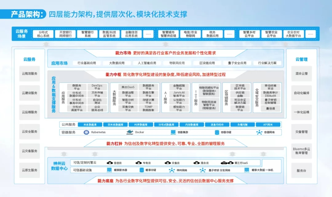 神州信創(chuàng)云作為全棧自主可控的信創(chuàng)云整體解決方案,提供從整體規(guī)劃到實(shí)際建設(shè)的全生命周期服務(wù)。內(nèi)建四層能力架構(gòu),提供層次化、模塊化技術(shù)支撐:能力底座為各行業(yè)數(shù)字化轉(zhuǎn)型提供可信、安全、靈活的信創(chuàng)云數(shù)據(jù)中心服務(wù)支撐;能力杠鈴為信創(chuàng)及數(shù)字化轉(zhuǎn)型提供安全、可靠、專業(yè)、全面的管理服務(wù);能力中樞簡(jiǎn)化數(shù)字化轉(zhuǎn)型建設(shè)的復(fù)雜度,降低建設(shè)風(fēng)險(xiǎn),加速轉(zhuǎn)型過程;能力市場(chǎng)更好的滿足各行業(yè)客戶的業(yè)務(wù)發(fā)展和個(gè)性化需求。