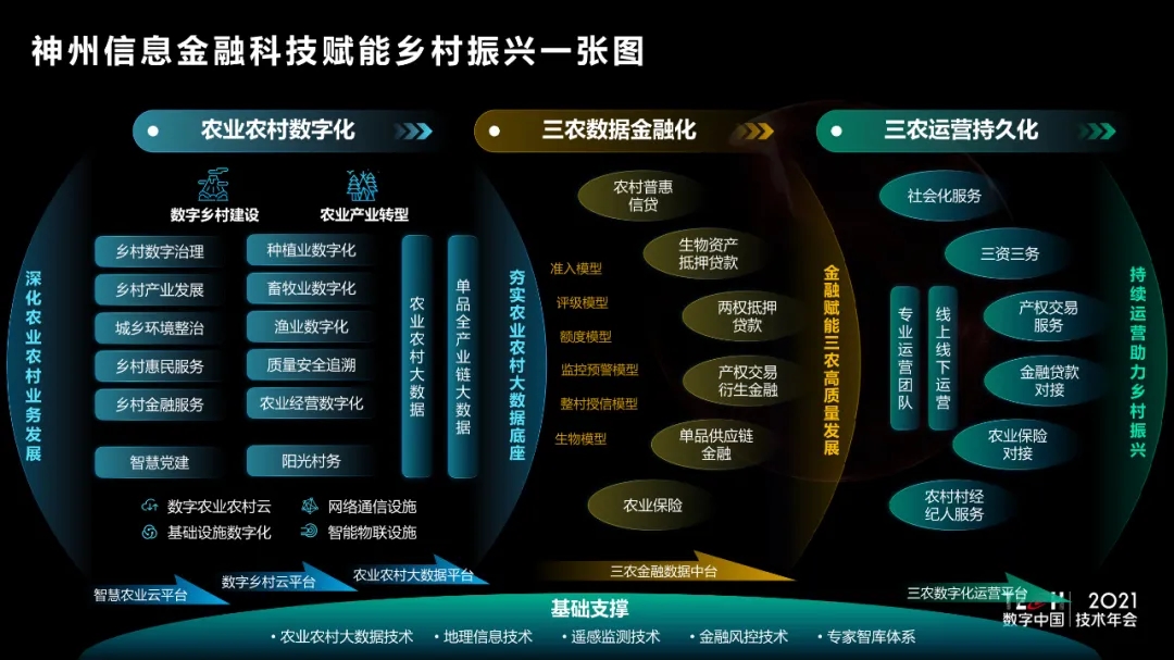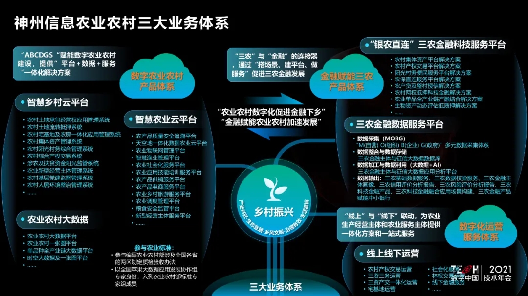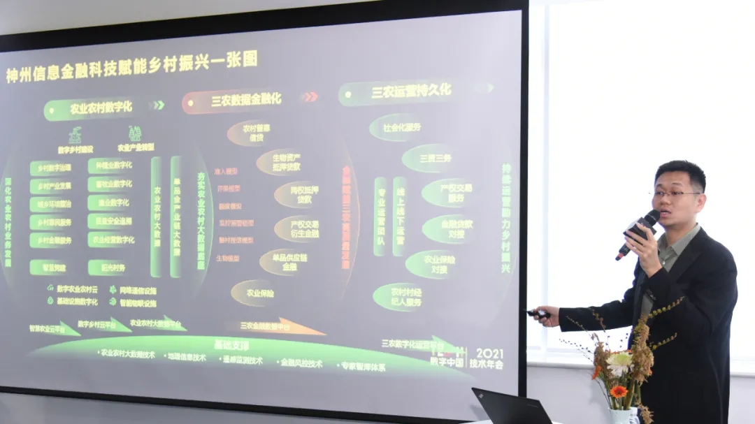 9月29日,TECH數(shù)字中國 2021技術(shù)年會——“場景創(chuàng)新·賦能高質(zhì)量發(fā)展”主題論壇在西城區(qū)新動力神州信息金融科技創(chuàng)新中心舉辦。神州信息農(nóng)業(yè)BG副總裁劉燁做題為《金融科技賦能鄉(xiāng)村振興一張圖》主題演講,并發(fā)布“神州信息金融科技賦能鄉(xiāng)村振興一張圖”,通過“農(nóng)業(yè)農(nóng)村業(yè)務(wù)數(shù)字化+農(nóng)業(yè)農(nóng)村資產(chǎn)金融化+農(nóng)業(yè)農(nóng)村運營持久化”,提供完善的整體解決方案,從夯實農(nóng)業(yè)農(nóng)村大數(shù)據(jù)底座、金融賦能三農(nóng)高質(zhì)量發(fā)展到未來持續(xù)運營服務(wù),助力國家鄉(xiāng)村振興戰(zhàn)略全面有效落地,為農(nóng)業(yè)農(nóng)村現(xiàn)代化發(fā)展的總體思路、發(fā)展目標(biāo)、重點任務(wù)提供指引。