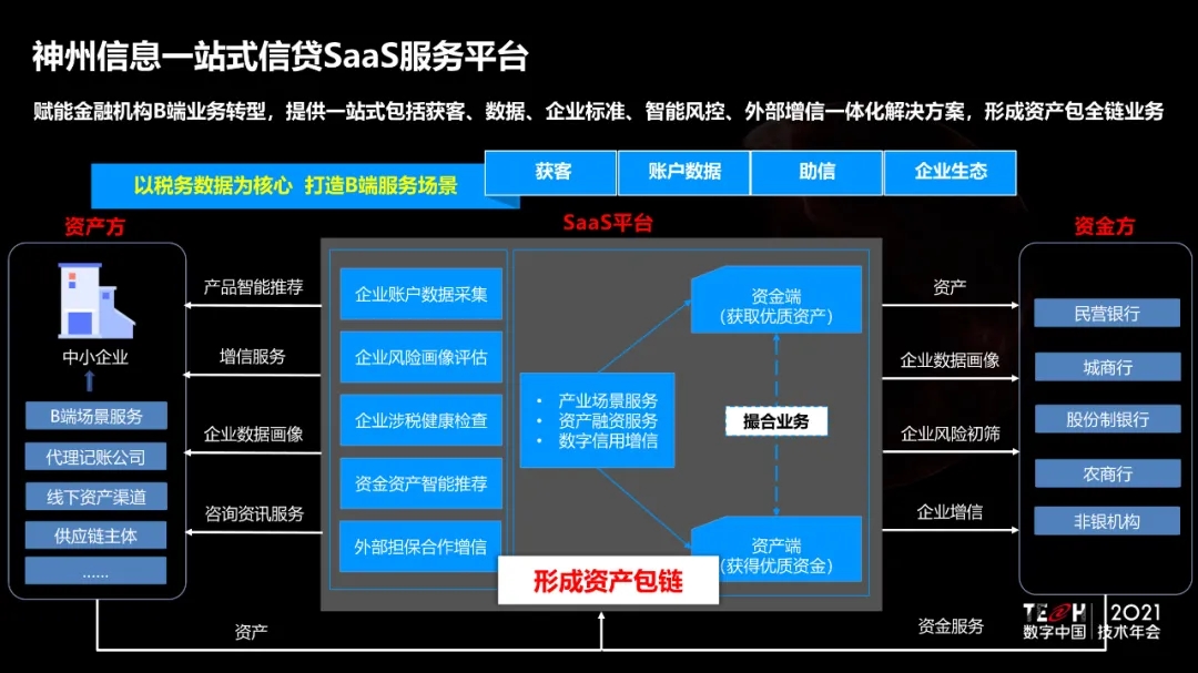 9月29日, TECH數字中國2021技術年會——“場景創新·賦能高質量發展” 主題論壇上,神州信息重磅發布自主研發的“一站式信貸SaaS服務平臺”。該平臺賦能金融機構B端業務轉型,提供一站式包括獲客、數據、企業標準、智能風控、外部增信一體化解決方案,形成資產包全鏈業務,為服務實體經濟,助推中小微企業新發展提供有力支持。