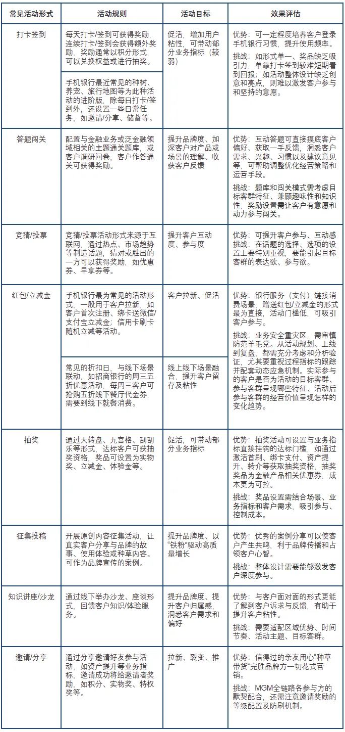 不同活動形式可以帶來不同的營銷效果。我們把適合在手機銀行開展的、常見的活動形式及其規(guī)則、目標、效果、優(yōu)勢和挑戰(zhàn)等總結(jié)梳理在(表1)供大家參考使用: