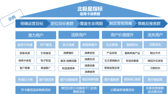 以信用卡活動為例(圖2),如果設(shè)定信用卡消費額提升作為北極星指標,可先根據(jù)目標客群所處生命周期做階段劃分,如潛力用戶、活躍用戶、成熟期用戶、流失用戶。對處于不同階段的客群,運營工作的重點也是有所差異的。比如,潛力客群的運營更關(guān)注申請及激活率,而對流失風險較高的客群則更關(guān)注沉默時長、挽回率等指標。待目標拆解到位之后,再圍繞細化指標有針對性地開展活動策劃。