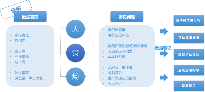 活動數(shù)據(jù)體系的設(shè)計可以參考零售經(jīng)典“人-貨-場”運營模型(圖5)來實現(xiàn)數(shù)據(jù)驅(qū)動的精細化運營。“人”——洞悉相關(guān)客群(參與 vs. 未參與,App渠道 vs. 短信渠道等)的分布結(jié)構(gòu)、畫像分析、風險分析等。“貨”——金融類或泛生活類產(chǎn)品和服務等活動權(quán)益的選品、備貨、上架、成交和售后等。如金融產(chǎn)品購買率或權(quán)益使用率較低,需要分析推薦產(chǎn)品或權(quán)益是否匹配目標客群,是否門檻過高或缺少吸引力。“場”——活動場域的“氛圍感”,包含客戶參與的流轉(zhuǎn)動線設(shè)計、活動頁面排版布局和視覺風格等,客戶參與活動體驗的流暢性也是活動非常重要的一環(huán)。