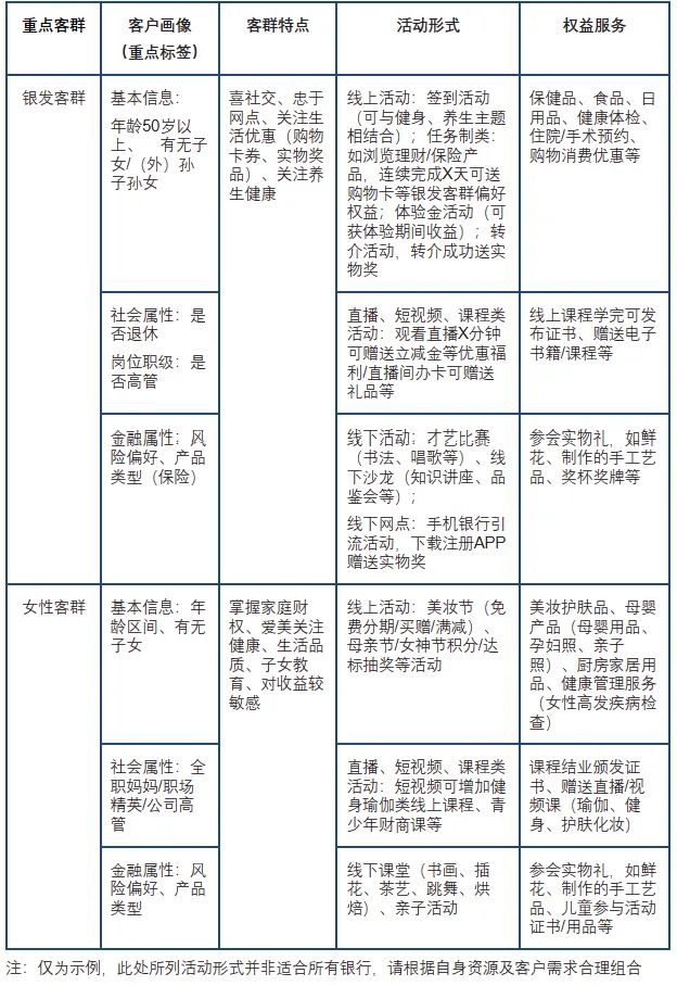 “適合的才是最好的”,作為示例(表2),根據(jù)當下多家手機銀行需要重點經(jīng)營的兩大類客群的特點和配套策略做了詳細的分析和拆解: