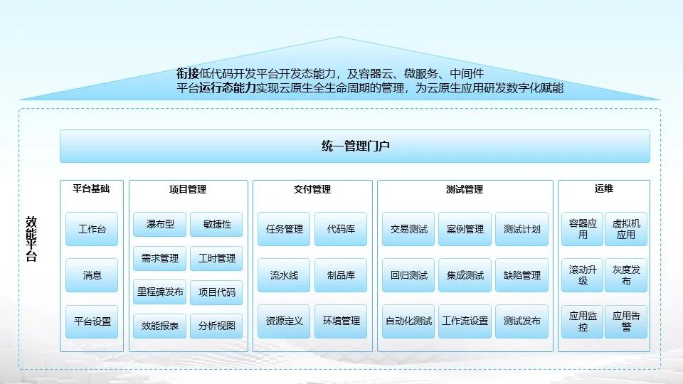 九天攬月-云原生研發(fā)效能平臺:由統(tǒng)一管理門戶、基礎(chǔ)應(yīng)用平臺、項目管理平臺、交付管理平臺、測試管理平臺和運維管理平臺六大部分組成,可實現(xiàn):