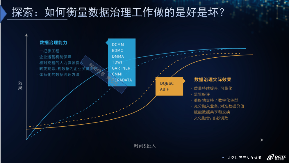 從能力和實(shí)際資產(chǎn)情況兩個(gè)維度就可以很好地來評(píng)估數(shù)據(jù)治理的效果。像國(guó)標(biāo)的DCMM數(shù)據(jù)管理成熟度評(píng)估是在衡量數(shù)據(jù)治理能力,而數(shù)據(jù)質(zhì)量平衡記分卡則是在衡量數(shù)據(jù)質(zhì)量的實(shí)際情況。兩者合一,都可以較好地說清楚數(shù)據(jù)治理的效果。