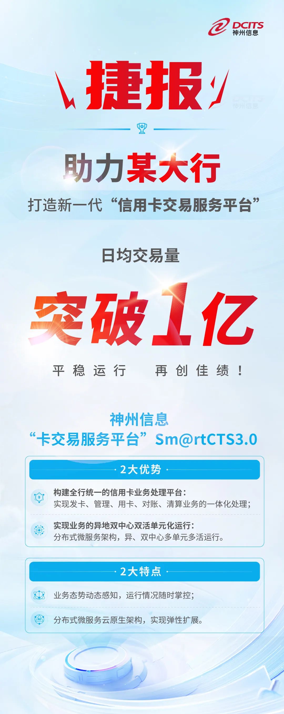 近日,神州信息助力某大行打造的新一代“信用卡交易服務平臺”日均交易量突破1億大關,為業務的平穩運行提供了有力保障。