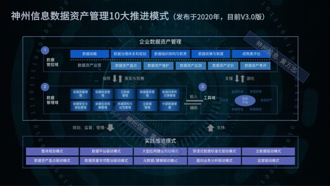 首先,來看數據治理實踐方法的選擇。神州信息早在2020年發布了數據治理實踐的十大推進模式,建議從咨詢、專題實施到工具三個層面來推動數據治理,根據企業的人、環境、經營狀態等實際,選擇合適的數據治理推進模式。衍生出了自上而下的整體規劃模式,數據平臺驅動模式,以及自下而上的面向業務分析驅動模式、數據資產盤點模式等。我們可以靈活地選取一種或者多種組合來實現數據治理實踐工作。