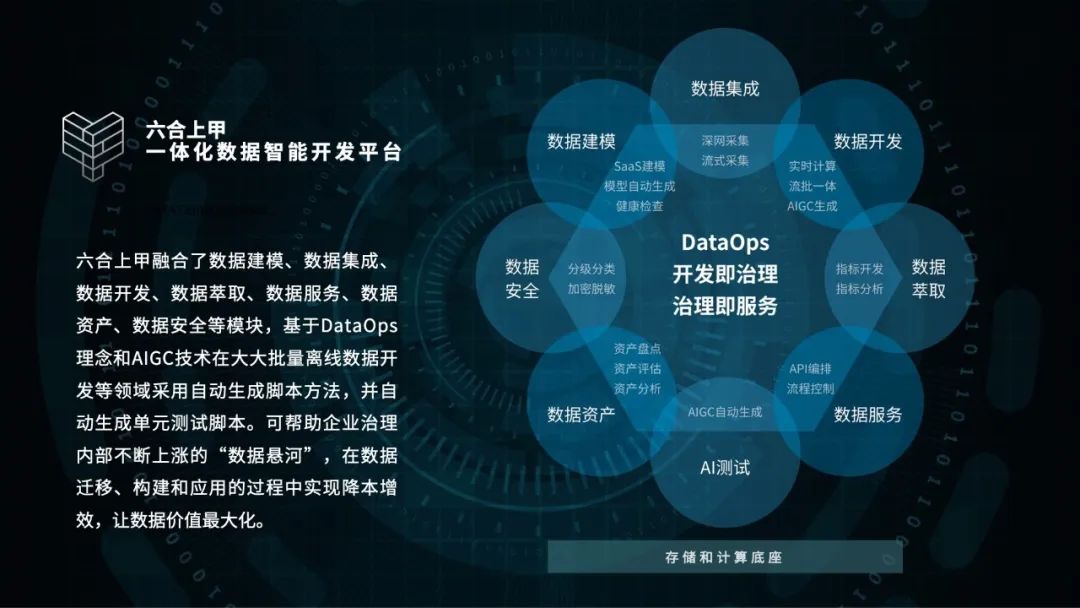 最后,黃萬忠聊到數據資產價值變現的方法,也著重推薦了神州信息在數據資產價值發揮方面的成功經驗。神州信息根據實戰經驗,開發了一款名叫“六合上甲”的一體化數據資產管理和服務平臺。它融合了數據建模、數據集成、數據開發、數據萃取、數據服務、數據資產、數據安全等模塊,基于DataOps理念和AIGC技術在大大批量離線數據開發等領域采用自動生成腳本方法,并自動生成單元測試腳本。可幫助企業治理內部不斷上漲的“數據懸河”,在數據遷移、構建和應用的過程中實現降本增效,讓數據價值最大化。