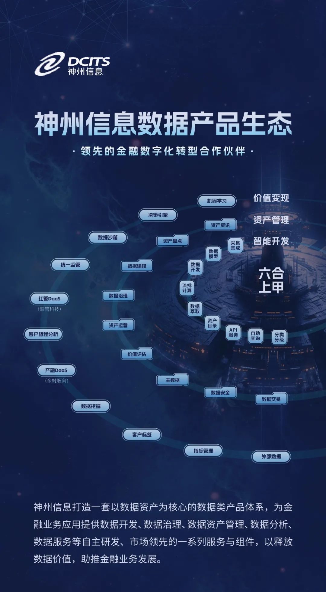 黃萬忠表示上下四方謂之“六合”,一等神兵謂之“上甲”,神州信息希望給市場一個關于數據資產價值發揮的實用工具。同時還重點介紹了利用六合上甲開發的幾個數據資產價值發揮的場景。