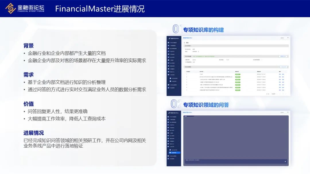 FinancialMaster綜合了金融場景模型、Prompt構建、大模型微調、大模型持續訓練等適配技術,實現金融專有知識的業務應用,并結合金融機構內部的相關信息,以及提供的各類業務系統的功能,改善用戶體驗,提供高效的資料查詢與信息提煉能力。