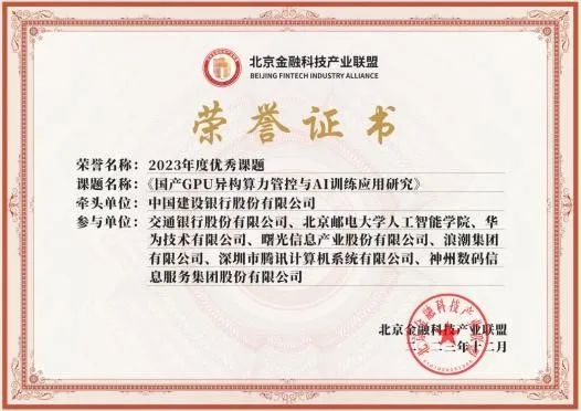 近期,北京金融科技產業聯盟2023年度會員代表大會在京成功舉辦。中國人民銀行科技司、中國人民銀行北京市分行、北京市地方金融監督管理局相關領導出席會議。作為聯盟單位,神州信息憑借在金融數字化領域突出貢獻和相關成績,獲評聯盟“年度優惠會員單位”“年度積極貢獻單位”“年度優秀專家”等榮譽,并且參與由中國建設銀行牽頭的《國產GPU算力管控與AI訓練應用研究》課題,神州信息獲評“2023年度優秀課題”榮譽。