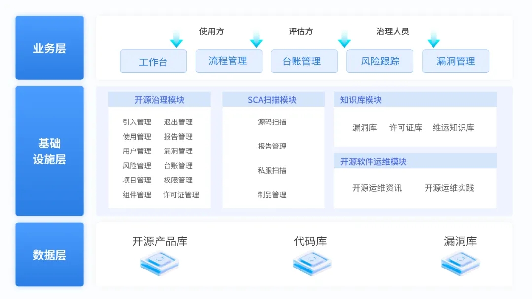 ◆ 強化管理:通過構建開源技術引入、使用、退出全生命周期管控能力,幫助客戶建立開源軟件資產庫,提升客戶對軟件資產的整體管理能力。通過軟件物料清單,時刻關注、適配業界漏洞情報,幫助客戶快速分析并識別可能存在的安全風險并及時預警。
