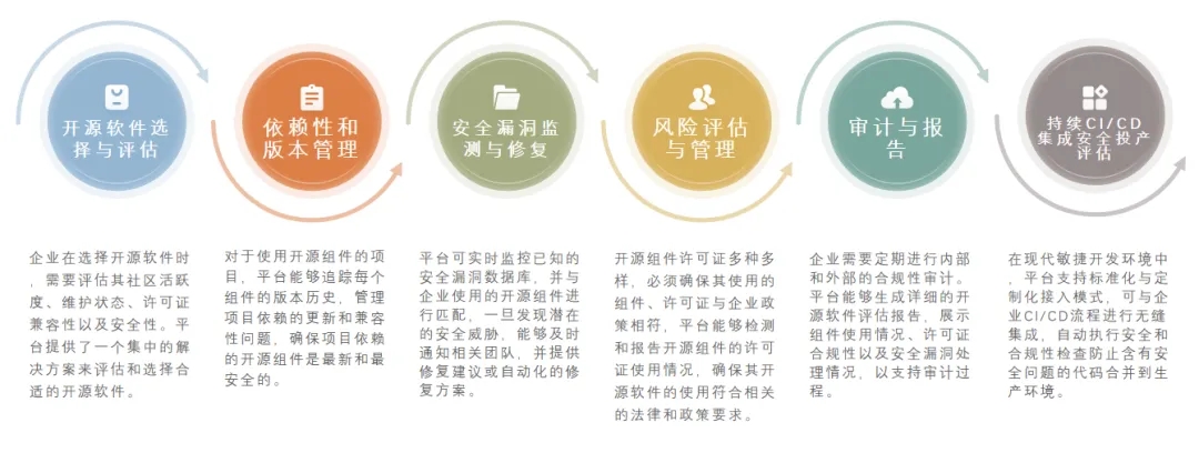 ● 開源軟件引入管理:在企業引入新的開源軟件之前,平臺可以進行預先的風險評估,包括對開源軟件的許可證、安全漏洞以及社區活躍度的審查。