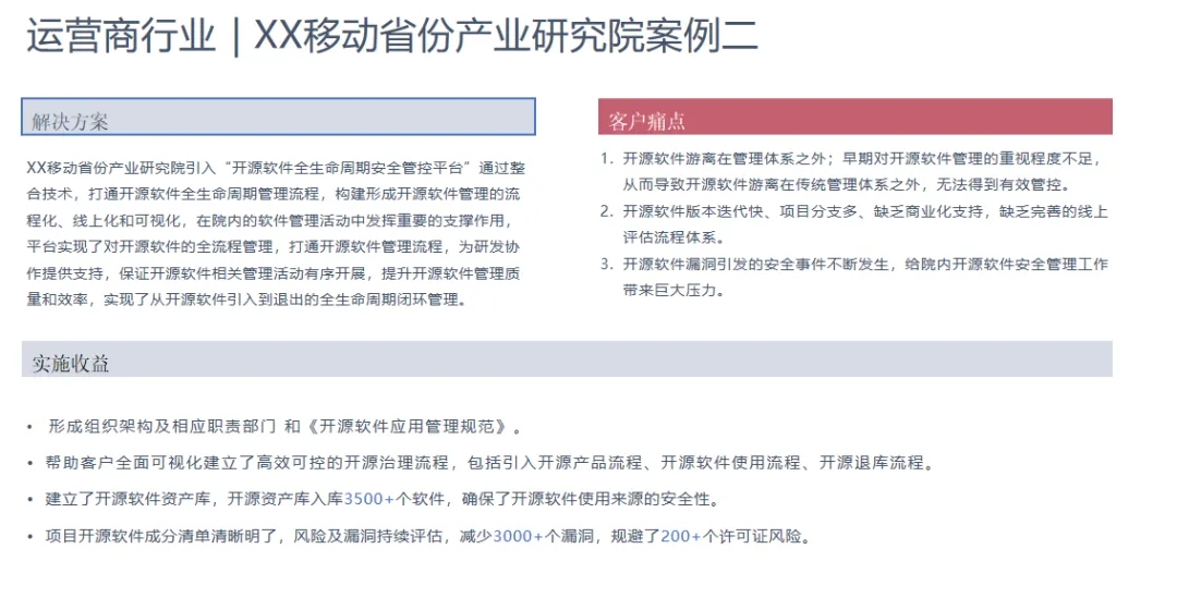 ◆ 創新和敏捷性:滿足市面上大部分客戶安全審核要求,為軟件做“全身無死角體檢”,能夠滿足企業不斷變化開源軟件治理的需求。可以幫助客戶更快地響應市場變化,推出創新產品和服務,提高企業的競爭力和市場敏捷性。