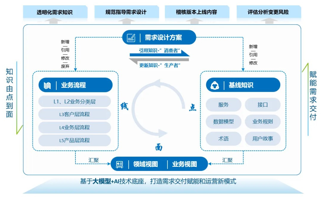通過數(shù)智化需求知識(shí)圖譜建設(shè),將需求知識(shí)從點(diǎn)、線逐步匯聚成面:不斷從需求過程中獲取散落的業(yè)務(wù)流程、服務(wù)和數(shù)據(jù)模型等知識(shí),形成業(yè)務(wù)流程和基線知識(shí),并將基線知識(shí)進(jìn)行串聯(lián),匯聚形成系統(tǒng)視圖和業(yè)務(wù)視圖。持續(xù)推動(dòng)需求知識(shí)整合和數(shù)智化應(yīng)用,將大模型技術(shù)應(yīng)用到需求開發(fā)交付環(huán)節(jié),深化“AI+需求交付”注智賦能,打造需求開發(fā)交付的“數(shù)字孿生”系統(tǒng);