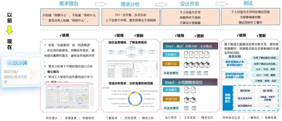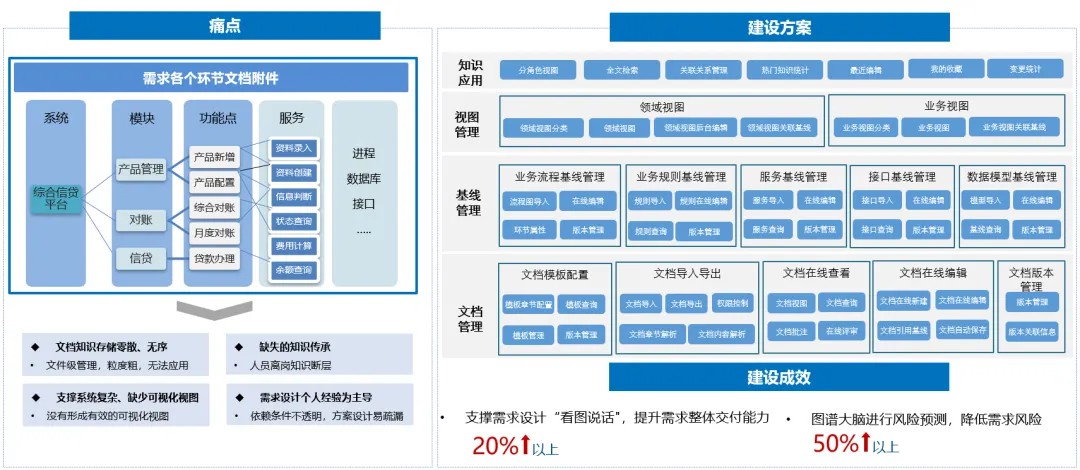 建設(shè)方案:將散亂的、與需求開發(fā)過程相關(guān)的各類知識(shí)進(jìn)行集中化、透明化管理,指導(dǎo)需求設(shè)計(jì)和開發(fā),提高方案設(shè)計(jì)效率和需求交付效能。
