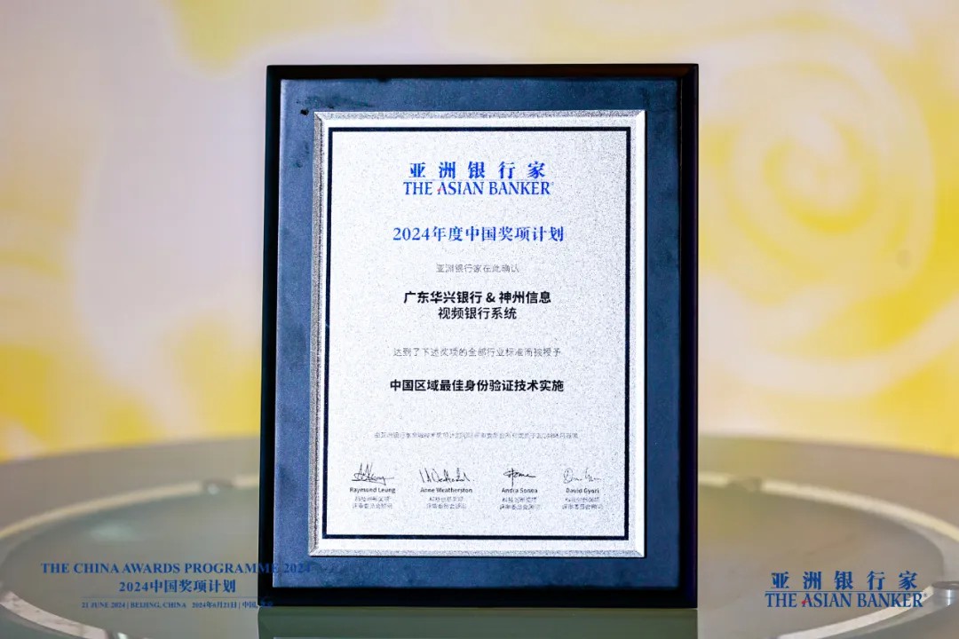 6月21日,亞洲銀行家2024中國獎項計劃頒獎典禮在北京舉行,神州信息助力廣東華興銀行打造的視頻銀行項目榮獲“中國區域最佳身份驗證技術實施”大獎。
