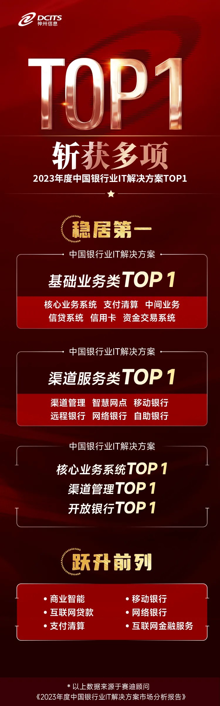 7月9日,賽迪顧問發布《2023年度中國銀行業IT解決方案市場分析報告》,報告顯示,神州信息2023年度在基礎業務類、渠道服務類、核心業務系統、渠道管理及開放銀行等領域繼續保持領導地位,在數據智能、信貸系統、移動銀行、網絡銀行以及市場風險等領域都取得新的進展。