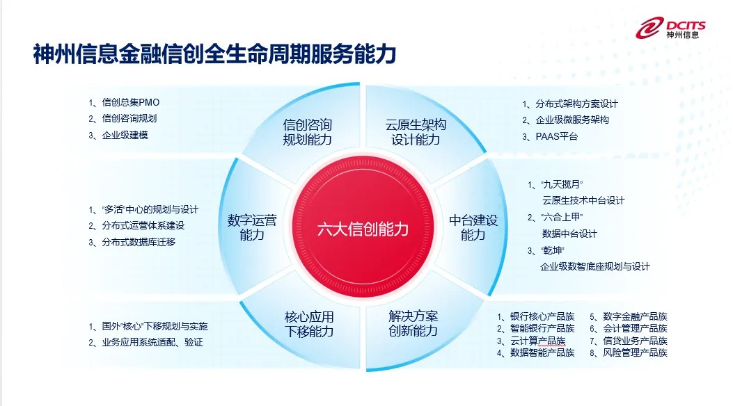 通過實(shí)踐積累,神州信息已經(jīng)形成了“信創(chuàng)咨詢、架構(gòu)設(shè)計規(guī)劃、中臺建設(shè)、解決方案實(shí)施、核心下移、數(shù)字運(yùn)營”六大方面的金融信創(chuàng)全生命周期服務(wù)能力,幫助國內(nèi)銀行、保險、證券、泛金融機(jī)構(gòu)提供一站式的金融信創(chuàng)服務(wù)。