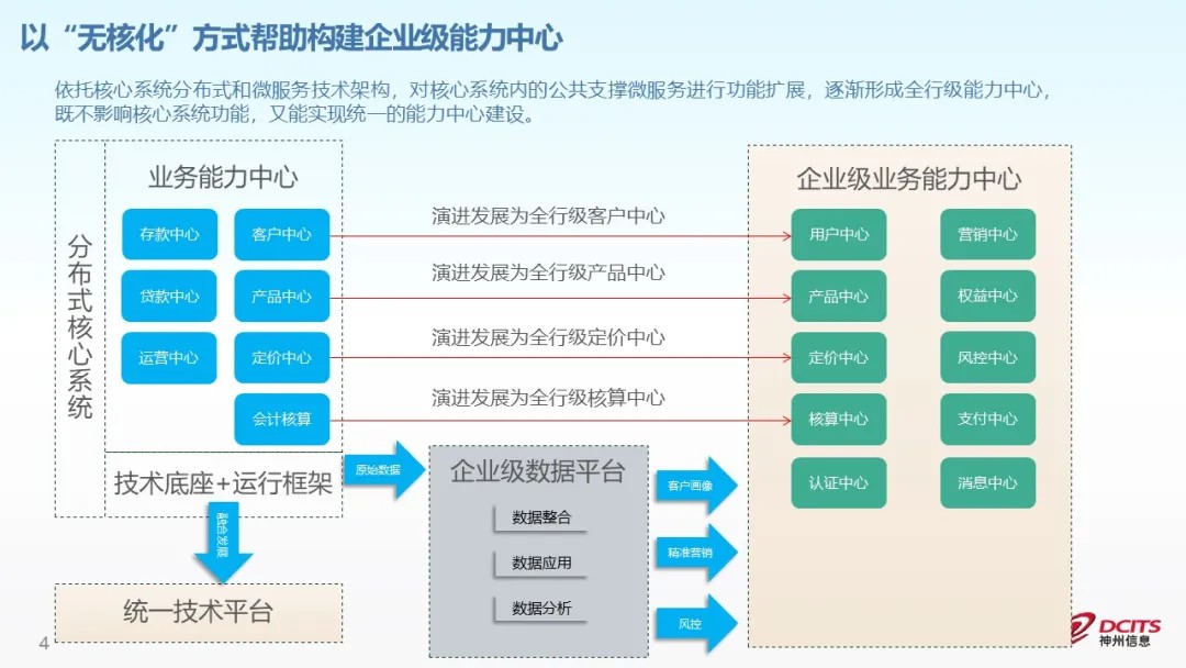 一是打破系統邊界,從單一的縱向能力支撐走向中臺化的能力橫向覆蓋。在企業級數據平臺支撐下,真正形成覆蓋全行業務系統的能力中心。