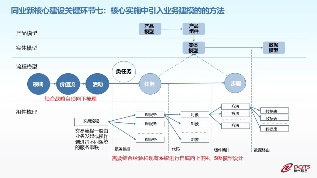 四是核心建設中如何引入業務建模的方法。面對越來越復雜的業務場景需求,原本更多基于功能的應用開發流程已經難以適用銀行業務開發的需要。而業務建模這一新型開發方式越來越受到重視,如何在核心建設中引入業務建模這一先進方法,流程識別和組件梳理是兩個關鍵。