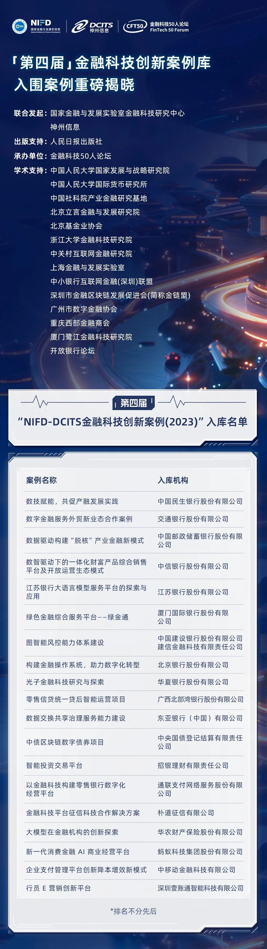 本屆入庫的19個案例,收錄于《數(shù)字金融+新質(zhì)生產(chǎn)力:金融科技創(chuàng)新實踐》一書中,已由人民日報出版社發(fā)行。我們真誠地向為本書順利出版提供過指導(dǎo)與幫助的專家和機(jī)構(gòu)致謝,未來期待更多的金融科技生態(tài)伙伴參與到案例編寫工作中。“NIFD-DCITS全球金融科技創(chuàng)新案例庫”旨在建設(shè)成為國內(nèi)外頂尖的金融科技創(chuàng)新案例聚合基地,不僅為政府、監(jiān)管、金融機(jī)構(gòu)和企業(yè)提供重要參考素材,還將為國內(nèi)外院校的教學(xué)、研究提供鮮活資料,有效服務(wù)于我國金融科技的健康發(fā)展,并且向國際社會充分展示我國優(yōu)秀金融科技企業(yè)的風(fēng)貌。